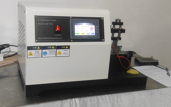 Adriving rotation round blade under a specified load cuts the glove held by the fixture of tester to and fro. After test, compare it with its original statuses toget the result.